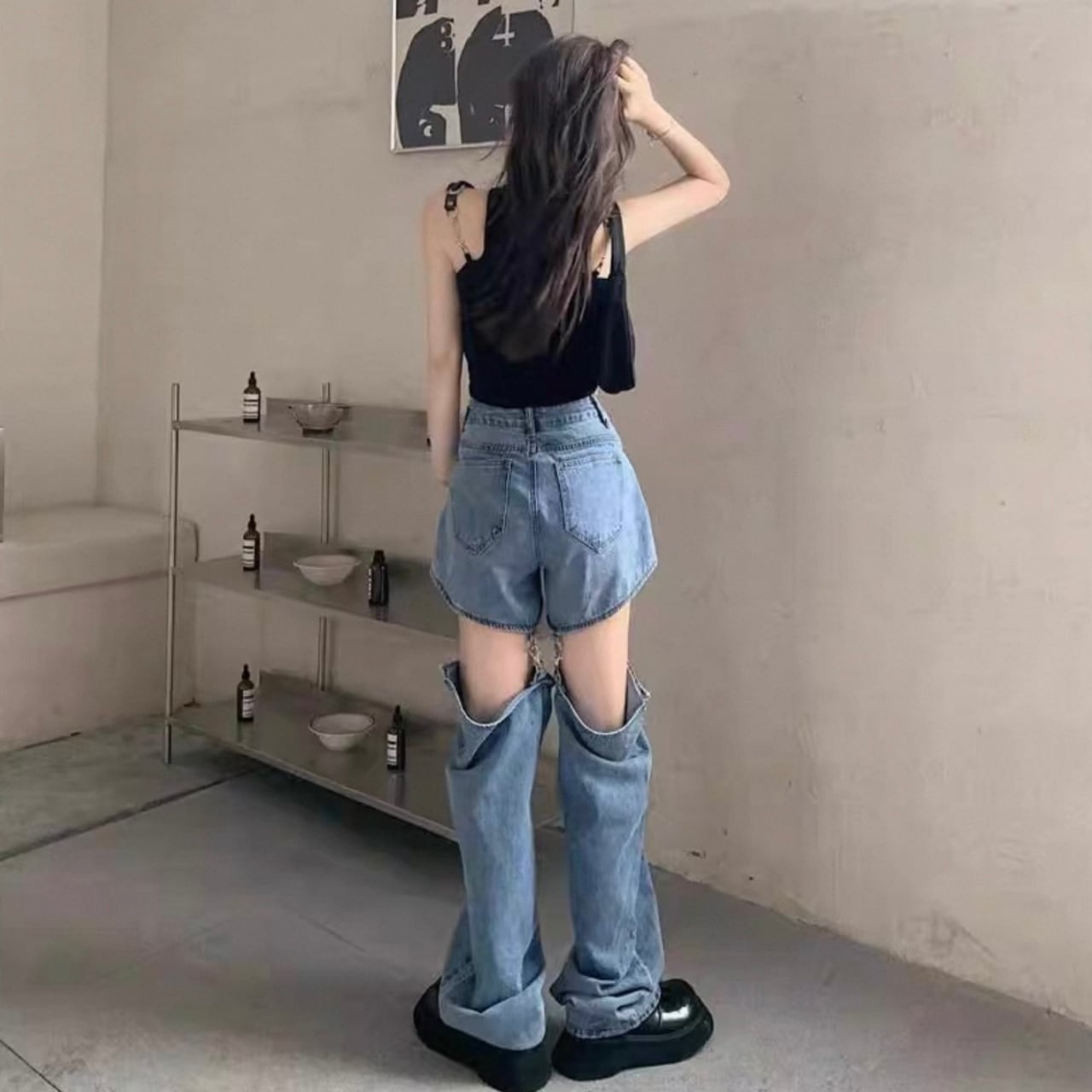 脚長効果のある、デニム変形ショートパンツ